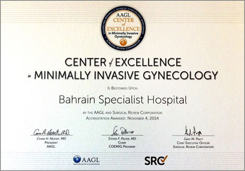 Recently the Surgical Review Corporation (SRC), and American Laparoscopy Association (AAGL), an independent healthcare quality organization and the world-leading administrator of Center of Excellence programs for surgery specialties, designated the Gynecology department at Bahrain Specialist Hospital as a Center of Excellence in Minimally Invasive Gynecology (COEMIG™). This is given to those hospitals and surgeons that meet specific quality and practice criteria following a comprehensive evaluation of hospital facilities, policies, procedures, and patient outcomes, worldwide. Appointed by the Surgical Review Corporation, Gynecological department at Bahrain Specialist Hospital joins the small group of nearly 170 out of the 5,185 registered hospitals worldwide, and 440 surgeons that hold this award.
