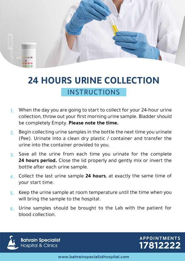 - When the day you are going to start to collect for your 24-hour urine collection, throw out your first morning urine sample. Bladder should be completely Empty. Please note the time.